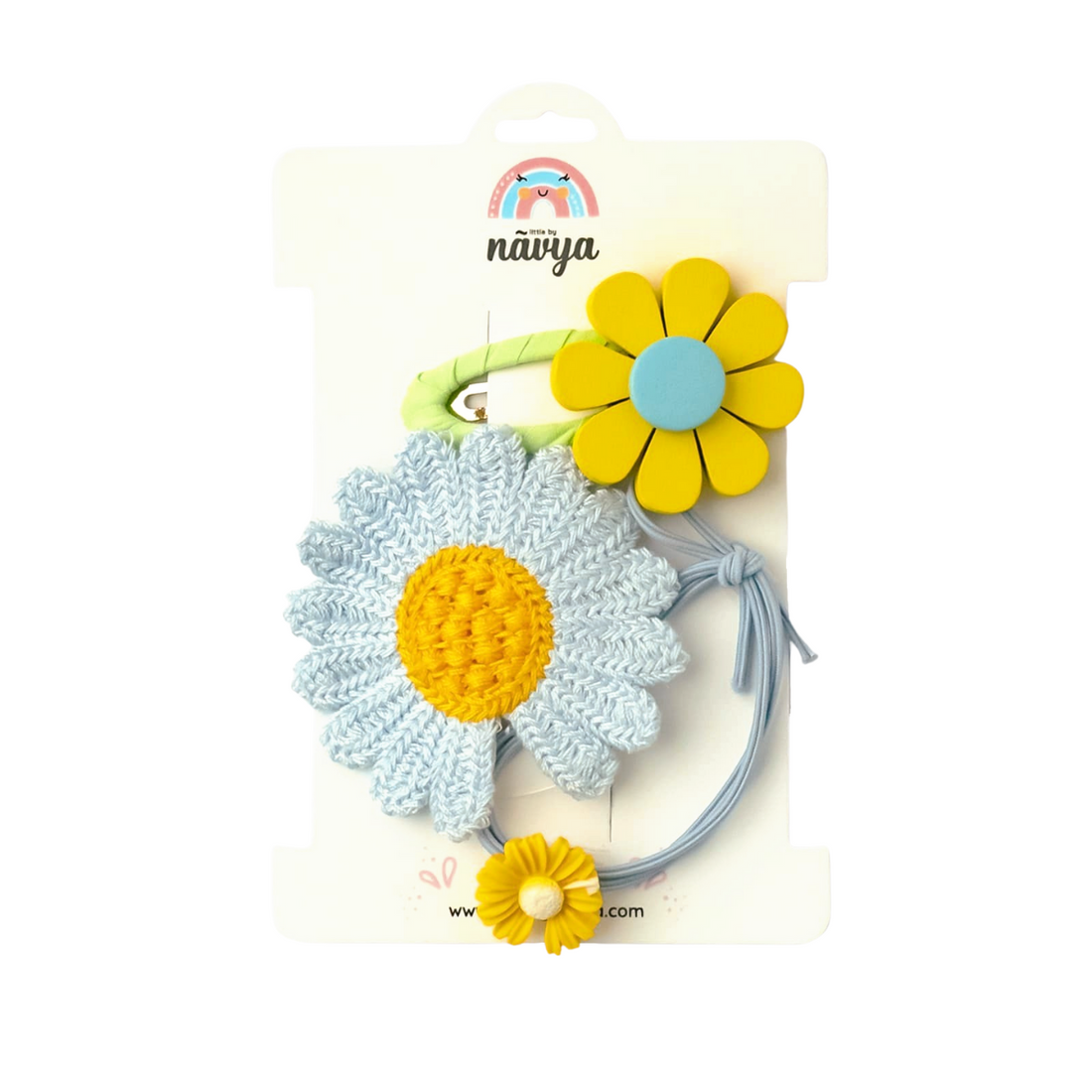 The Mellow Yellow Set of 3 - Yellow and blue Big flower clips and Rubber band(2-8 years)