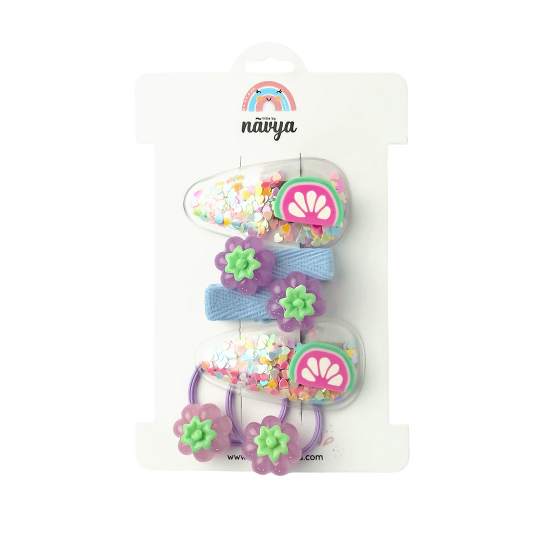 One in a Melon Set of 3 Pairs - Tic Tac Hair Clip & Rubberbands - Blue and Purple(2-8Years)